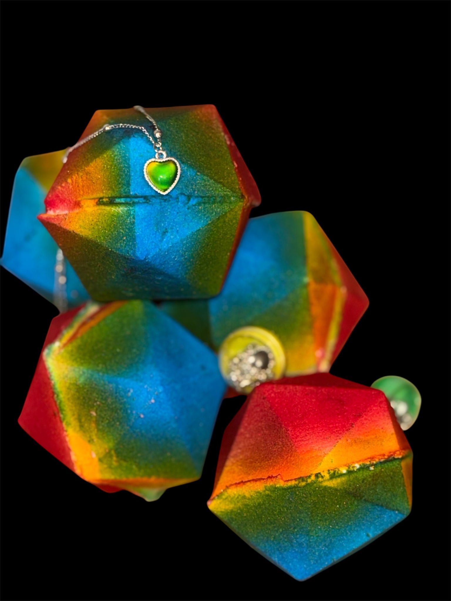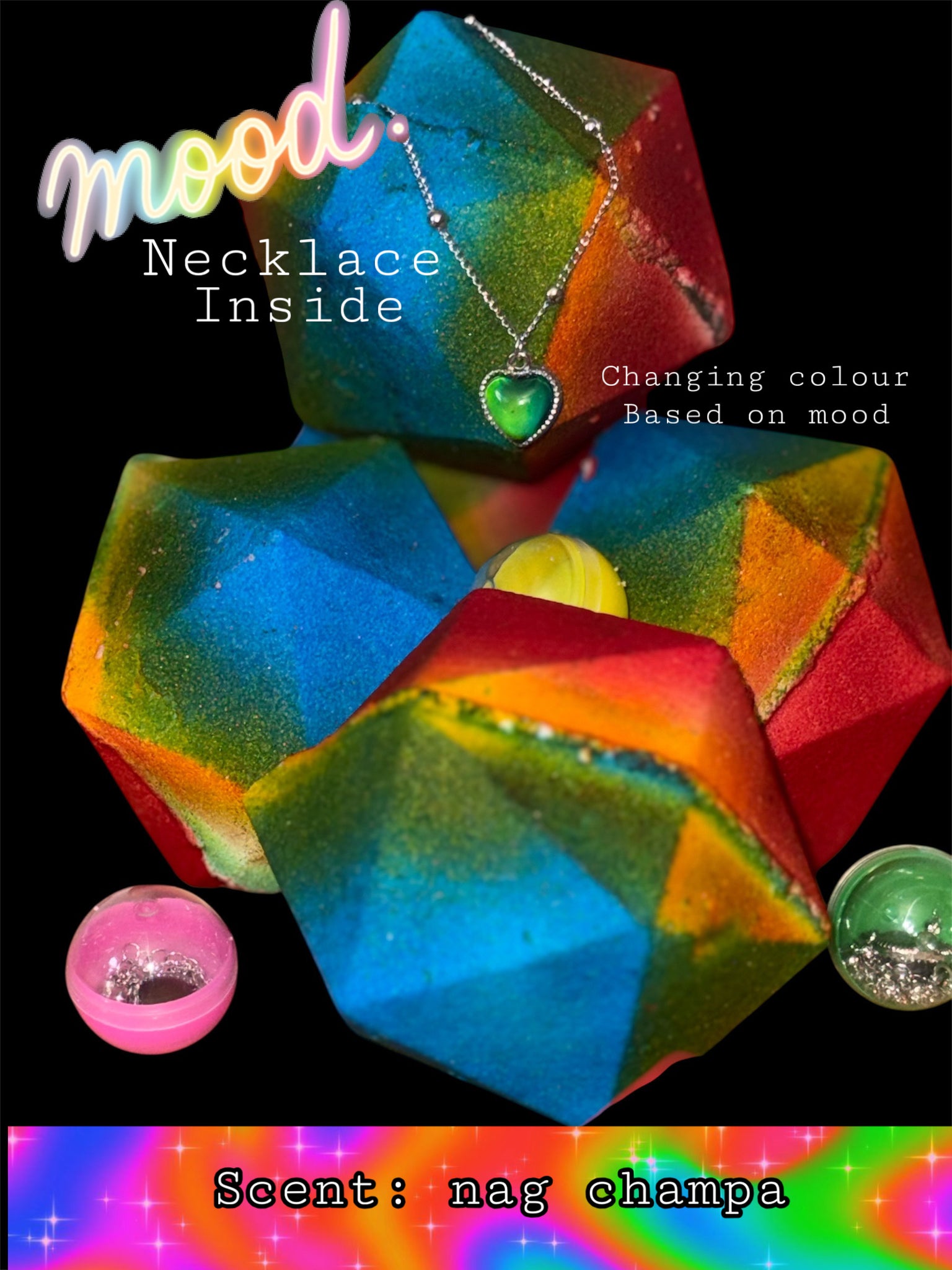 Bath bomb with necklace inside, scented in Nag Champa. Necklace changes colour based on heat (or emotion iykyk)