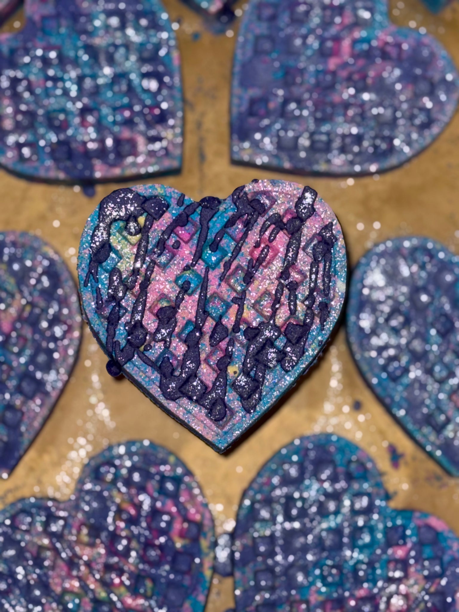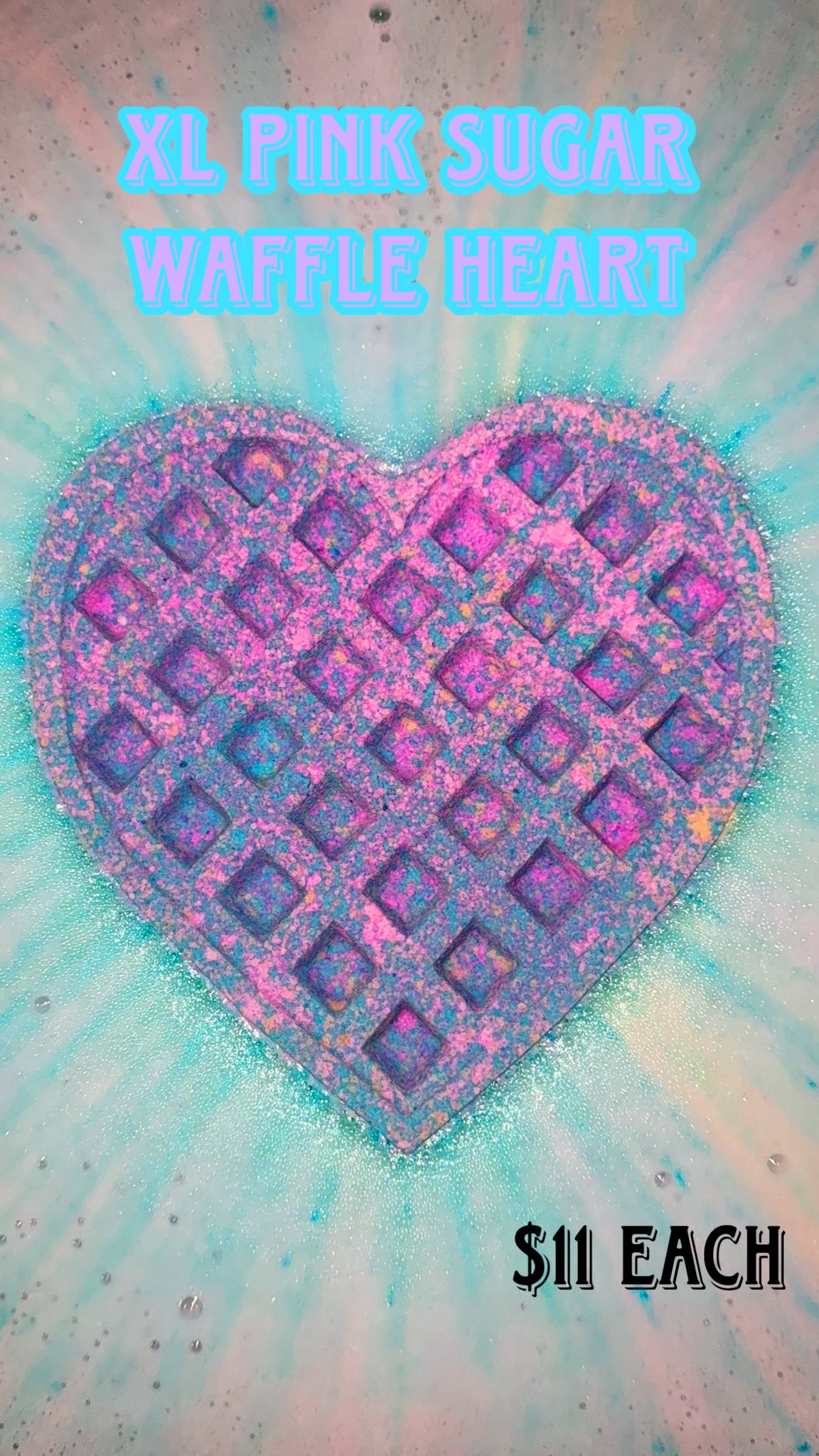 This listing is for one extra large bath bomb waffle heart scented in pink sugar! bringing back one of my OG bath bombs! Drizzled in cocoa butter goodness !